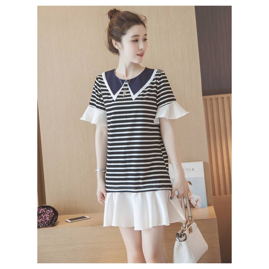 Váy Bầu Kẻ Đen Phối Chân Trắng Cổ Thủy Thủ free ship
